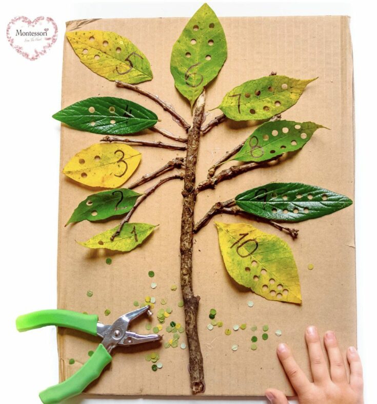 This leaf hole punch counting activity for preschoolers builds fine motor skills, sparks math learning, and keeps little hands busy with nature play. Explore with items from nature "What Does Ten Look Like?"